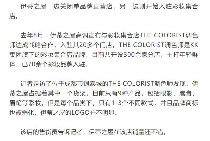 可以看出,伊蒂之屋已经改变线下渠道策略。伊蒂之屋方面曾回应,入驻THE COLORIST调色师并不意味着品牌会放弃线下市场,而是以集合店的渠道作为线下主要阵地。