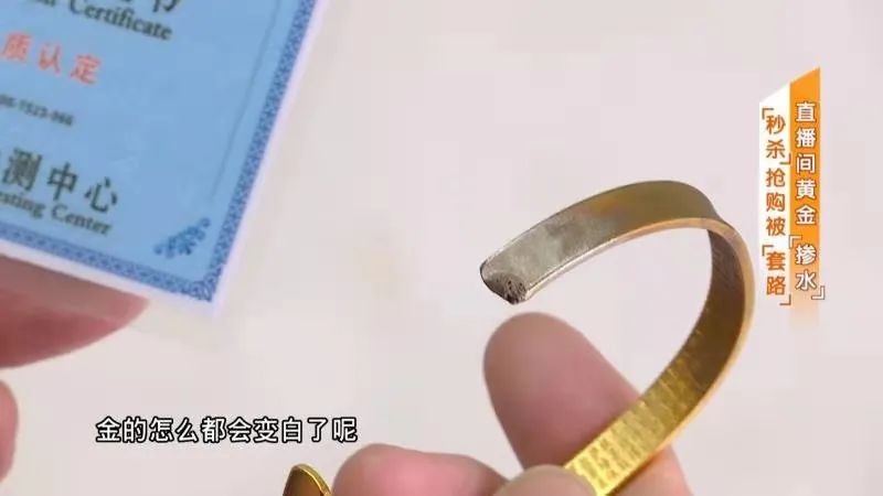一方面,主播声称支持实体店置换,另一方面又配有鉴定证书,自认为万无一失以后,赵女士在直播间“守”了三天,才总算抢到了这只镯子。可收到货以后却发现,这个款式并不适合自己,打算去实体店置换其他款式的时候,检测发现却是个假镯子,根本就没有金。