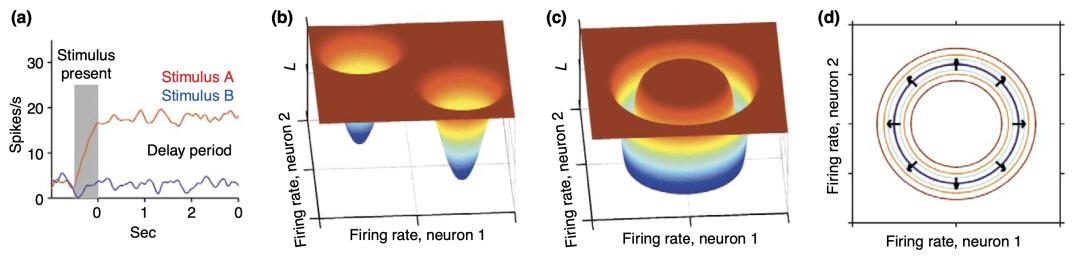 然而,以上所述的吸引子模型有一个问题:它只能用于编码离散的工作记忆。于是,冷泉港实验室的 Carlos Brody(现就职于普林斯顿大学)等人在2003 年为工作记忆提出了“连续吸引子模型”(continuous attractor model,见图2),填补了这一空缺。在连续吸引子模型中,(一般情况下)吸引子呈圆形,以支持对连续变化刺激(例如颜色、指针方向、物体温度等)的编码。