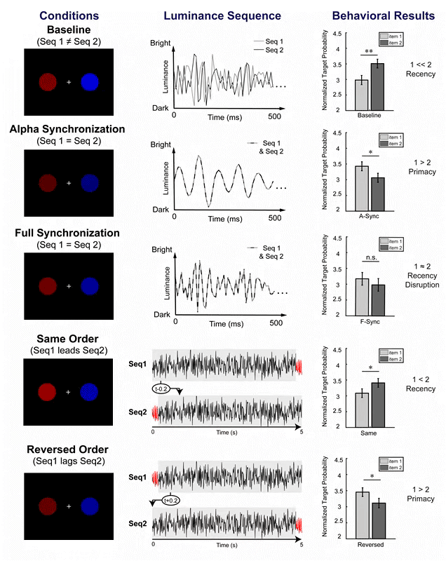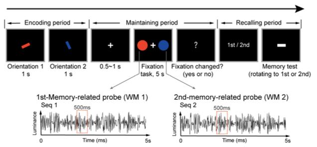 实验结果显示,在基线控制条件下,被试对首次出现的刺激记忆程度不如随后呈现的刺激,表现出了经典的近因效应,这与被试在不加圆盘刺激的控制条件中的表现相同;而在同步操控条件下,近因效应被破坏。研究者认为,这代表在记忆维持阶段,两个圆盘刺激的同步性能够调节被试的记忆表现。