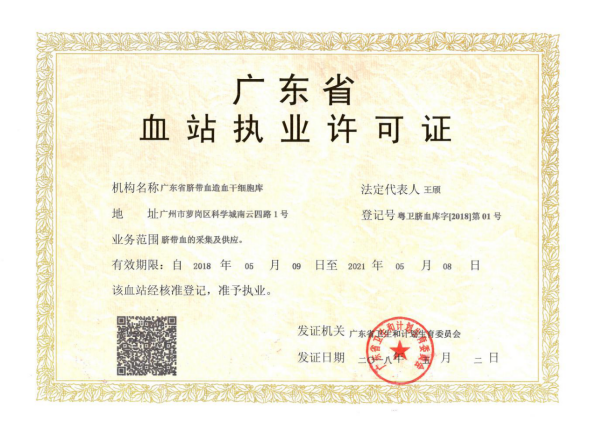 2006年获得由广东省卫生和计划生育委员会颁发的《血站执业许可证》 并通过每三年一次的再执业验收