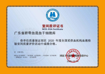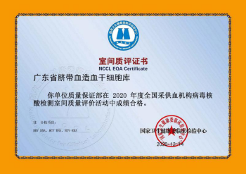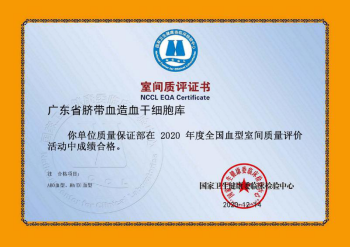 2020年获得由国家卫生健康委临床检验中心颁发的关于2020年度全国人类白细胞抗原(HLA)基因分型室间质量合格证书。