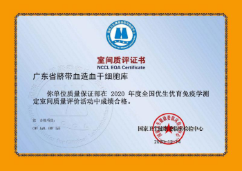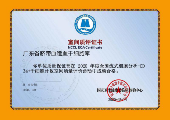 2020年获得由国家卫生健康委临床检验中心颁发的关于2020年度全国流式细胞分析-CD34+干细胞计数室间质评证书。