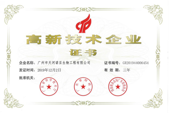 2010年至今获得由广东省科学技术厅、广东省财政厅、国家税务总局广东省税务局联合颁发的《高新技术企业》(编号:GR201944006454)证书