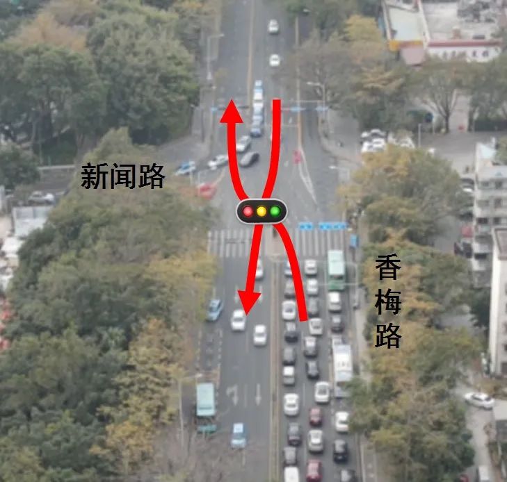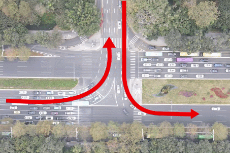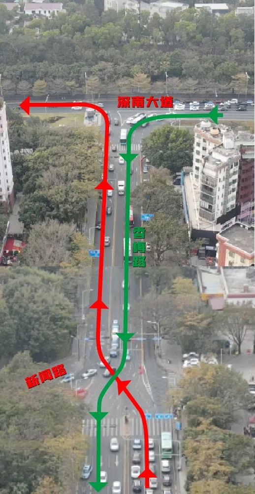 深南路左转进香梅路后,车辆不再靠右行驶而是靠左行驶,沿香梅路走到新闻路口时再通过信号灯恢复到靠右行驶;同时,香梅路左转进深南路的车辆,在新闻路口不再靠右行驶,而是靠左,在深南路口完成左转。可以实现路口左转同时放行,直行同时放行,减少了信号灯周期。这样一种突破常规的交通组织,其实在2016年就已有雏形。