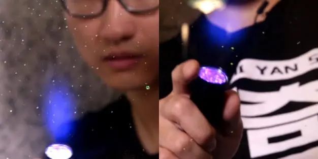 实验人员将会发光的荧光素钠,分别加入蹲坑和马桶的水槽中(嗯,黄黄的不是尿,是荧光剂),然后在正上方安置一块透明玻璃,观察冲厕所后玻璃液体溅起的情况。