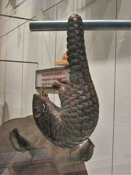 中华穿山甲的标本,它的尾巴具有盘卷能力,可以把自己挂在树枝上。图片:Claire H. / Wikimedia Commons