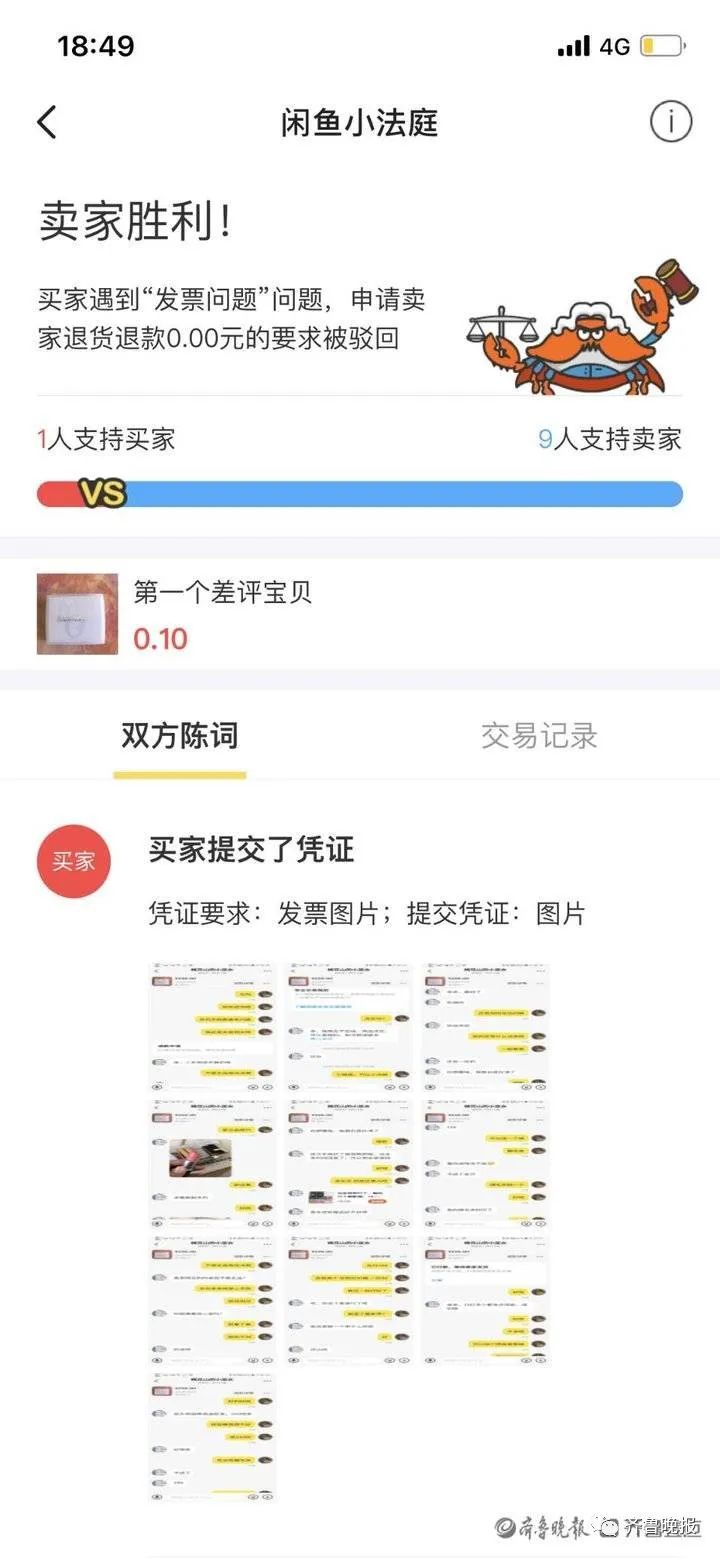 这场“官司”可谓复杂冗长,真假难辨,齐鲁晚报·齐鲁壹点记者在评判过程中看不到其他陪审员的数量、动态以及当前投票情况;五个小时之后,齐鲁晚报·齐鲁壹点记者收到了“小法庭任务完成”的通知,最终投票结果是卖家以9比1胜诉。