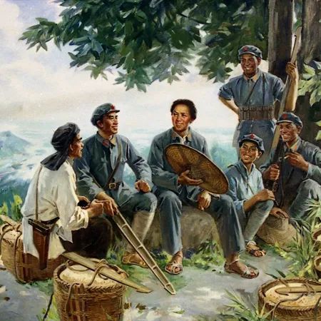 1928年冬天,毛泽东和朱德与井冈山军民运粮时,在黄洋界荷树下歇息的情景