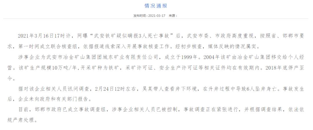 针对近日网曝“武安铁矿疑似瞒报3人死亡事故”,武安市多部门联合展开核查。3月17日,武安市人民政府网站发布情况通报,经初步核查,媒体反映的情况属实。涉事企业为武安市冶金矿山集团团城东矿业有限责任公司,成立于1999年。2004年该矿由冶金矿山集团移交给个人经营。2月24日12时左右,吴某带人查看井下环境,在升井过程中导致6人坠井身亡。事故发生后,企业未向政府和有关部门报告。目前,邯郸市政府已成立事故调查组,涉事企业相关人员已被控制,事故调查正在进行中。(人民日报、武安市人民政府网站)