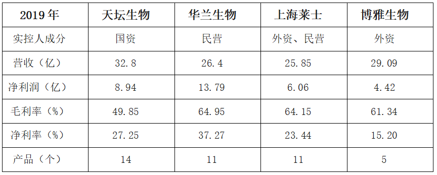 以2019年末数据对比来看,天坛生物在营收、净利润、产品数上占优势,但毛利率和净利率偏低。
