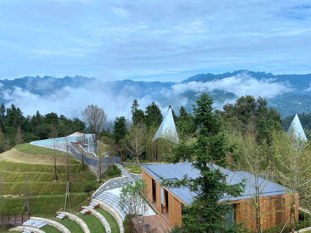 茶垄绕山,清香扑鼻。云雾之间,小径深处,十几栋造型别致的度假小屋藏匿其间。屋外,山桃花、梨花、樱花开得正艳。漫步其间,各种花香与满山的茶香交织在一起,酿造出最美的茶园风光。