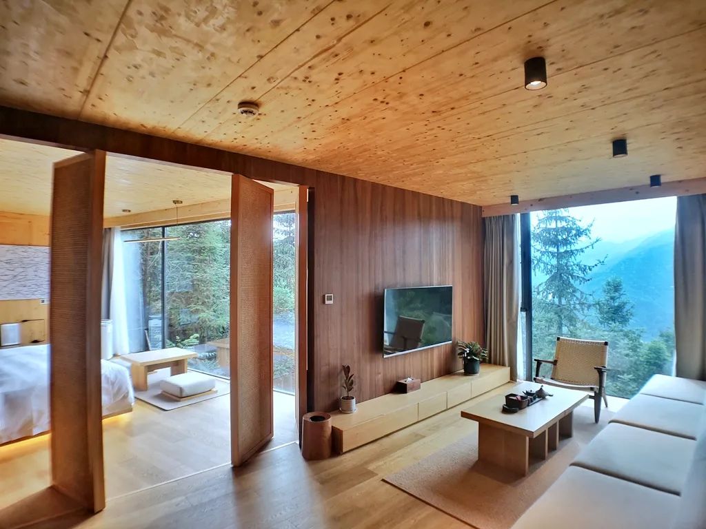 走进其中一栋木屋,简洁却又不失大气,其面对森林的方向全部为玻璃墙壁,在屋内只要抬眼就能看到莽莽林海,而从外往内则什么都看不到确保了住客的隐私。客厅右侧是一个半开放式的阳台,一张茶艺桌处在正中央,非常适合三五好友聚在一起,看风景品香茗。朱周介绍,木屋酒店首开区于去年8月9日开业,目前接待游客数千人,其中北上广深等地游客慕名而来,“有些客人一住就是一个星期。”