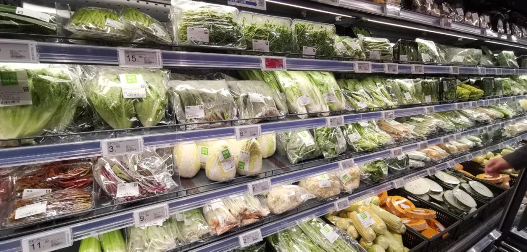 在红松店,进门就能看到生鲜区域,500克一颗白菜,6元一包菠菜……所有菜品都是标准化包装,无需过称。