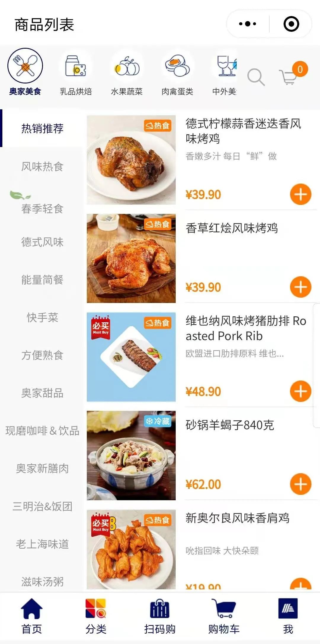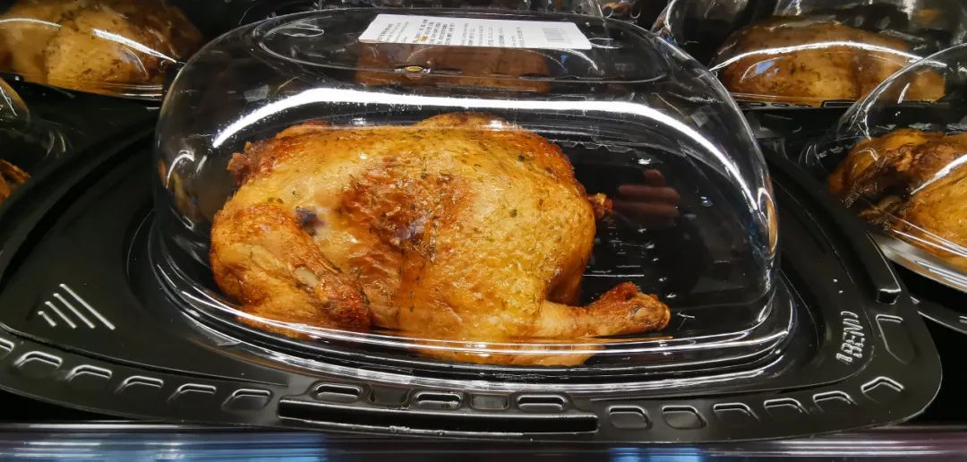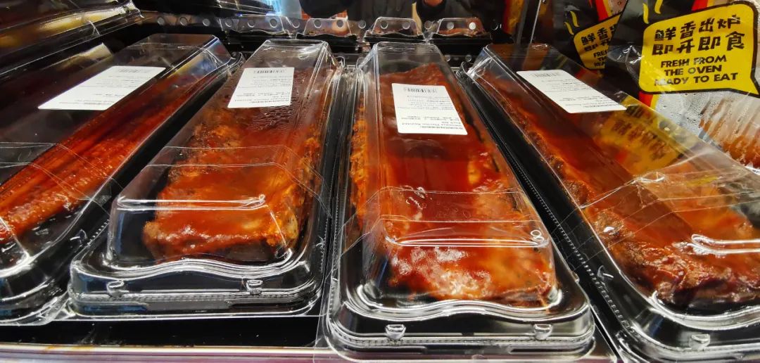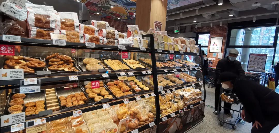 在烘焙区域,新鲜出炉的现烤面包、烤鸡等整齐地摆放在玻璃橱窗内,供消费者自由挑选。