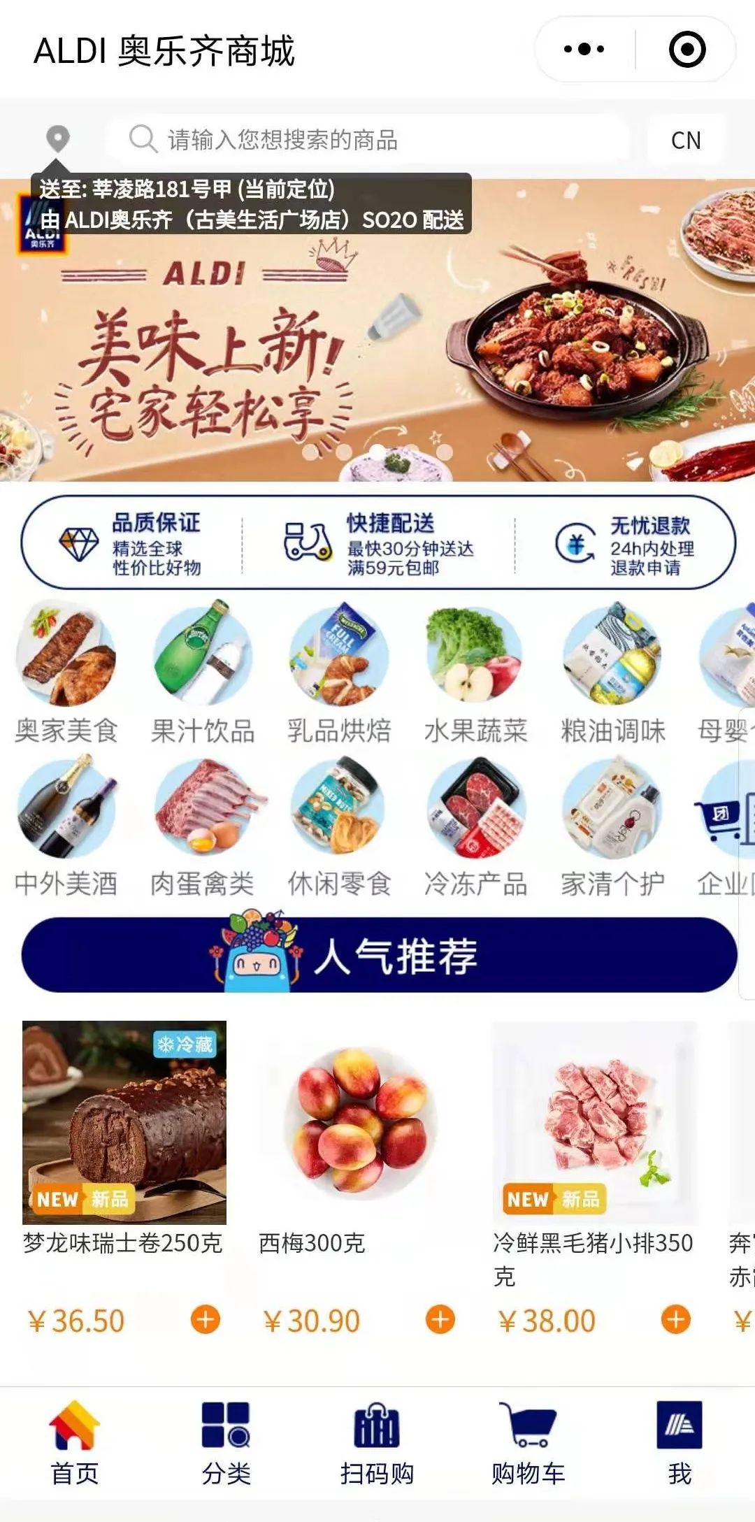 如今,ALDI奥乐齐每一家门店都开通了线上下单,线下配送模式。提供3公里内送货上门服务。住在距门店3公里内的居民,可通过微信小程序商城进行选购,购满59元即可享受免费送货到家服务,最快30分钟即可送达。