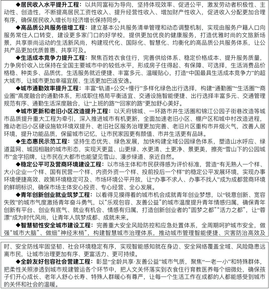 ——努力建设以共享为新局面的人本化发展先行区。世界文创、旅游、赛事名城和国际美食、音乐、会展之都建设整体成势,国际消费中心城市吸引力和美誉度持续增强,现代化基础设施体系、优质均衡公共服务体系、全覆盖多层次社会保障体系、党建引领双线融合治理体系进一步完善,法治成都建设取得新进展,民生福祉显著提升,成为“人民城市”的幸福样本。