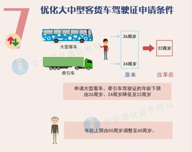 准驾车型年龄下限年龄上限调整前调整后调整前调整后大型客车(A1)26周岁22周岁50周岁60周岁牵引车(A2)24周岁22周岁城市公交车(A3)20周岁中型客车(B1)21周岁20周岁大型货车(B2)20周岁