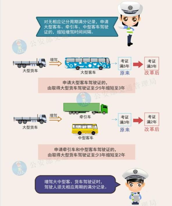 温馨提示:增驾大中型客、货车驾驶证时,驾驶人须无相应周期的满分记录。