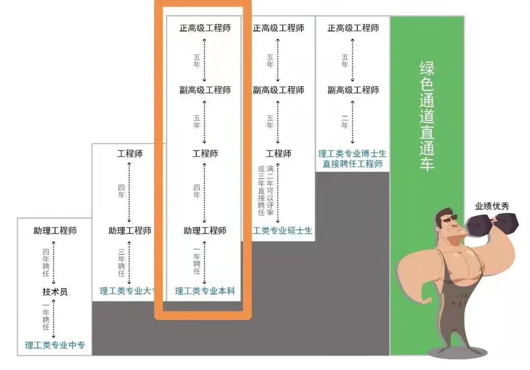 如果把职称比喻成一条通往山顶的路的话,那么具备一定的学历,从事专业技术工作是起点,每前进一段,这个就是指工作年限,就可以升级,从初级到中级到高级,直到山顶的正高级。