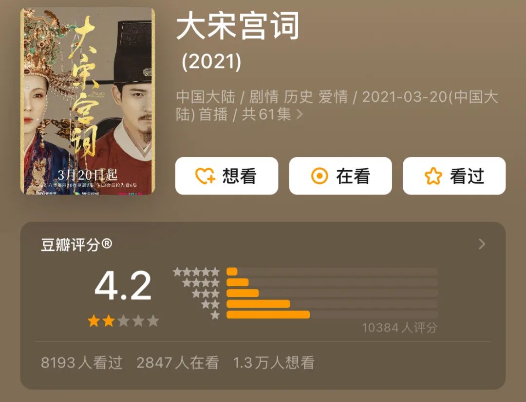 如今,豆瓣评分4.2分的《大宋宫词》已成李少红导演剧集中最低分作品,而2000年播出的《大明宫词》,评分高达9.1分。