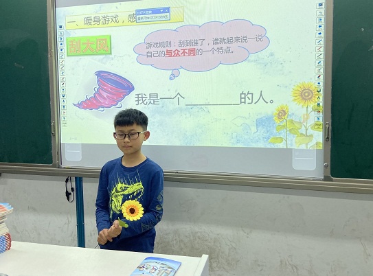 课程中,“刮大风”的游戏让同学们在轻松愉悦的环境中进入了课程状态,接下来的“点亮闪光卡环节”中,同学们通过寻找并分享自己闪光点的活动,发现每个同学都有那么多的优点,他们的身上都有值得大家欣赏的一面,都是独一无二的,这就是独特的“自我”。随后,老师们对一系列伟人故事的分享让同学们认识到,既要看到自己的长处,欣赏自己,也要看到自己的短处,勇敢地接受自己的不足和缺点,甚至是缺陷,可以让自己活出生命的精彩。在情景表演环节,同学们通过观察身边的故事,交流出悦纳自我,完善自我的方法:发现优点,自我鼓励;面对不足,努力改善;不能改善,勇敢接受;相信自己,永不放弃。最后,同学们在诗歌《如果你不能成为山顶的一株松》中,愉快的结束了课程。