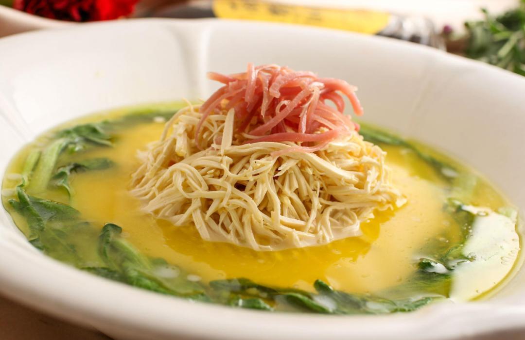 文思豆腐是一道有着悠久历史的汉族传统名菜,只见上千条长如牙签,细如粉丝的豆腐丝,漂浮游弋在清汤之中,轻盈、洁白、精致。吃起来,既爽滑柔润,又清鲜利口。回味之际,让人禁不住叫好。