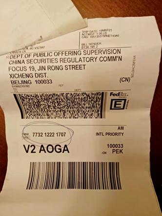 刘泽猛特地给记者发来一张快递的收据单照片。上述照片显示,它来自于大洋彼岸的加拿大,目的地是中国证监会。