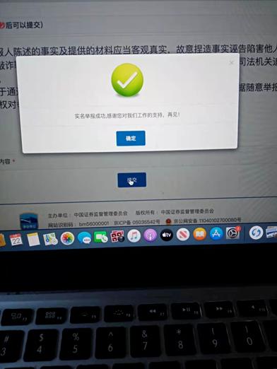 为了证明自己实名举报的真实性,23日,刘泽猛还向记者展示了成功在证监会官网进行实名举报的图片。