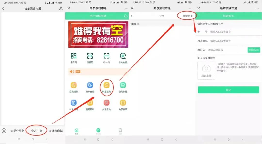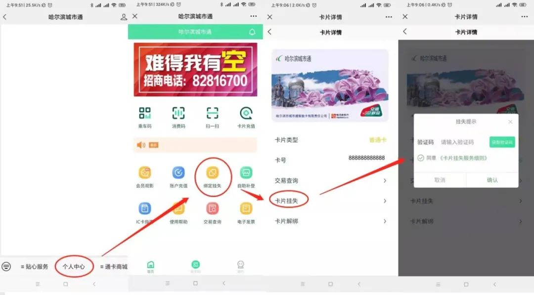 持卡用户通过“哈尔滨城市通”微信公众平台APP,点击“个人中心”—“绑定新卡”,输入卡片信息后,即可实现实名注册。一旦卡片丢失,也可通过微信公众平台及APP,点击“个人中心”-“绑定挂失”-“卡片挂失”,即可进行挂失操作。用户完成卡片挂失并审核通过后7日内,余额自动转入哈尔滨城市通账户。