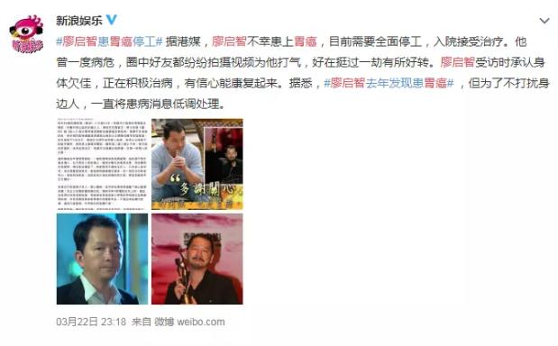 3月22日,据多家媒体报道,香港影星廖启智不幸患上胃癌,目前需要全面停工,入院接受治疗。