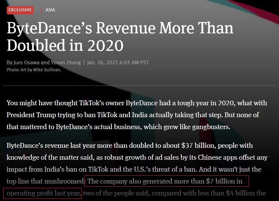 给大家找个对比,根据 The Information 报道,去年字节跳动的营业利润超过 70 亿美元。