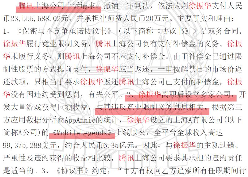 法院最终判定徐振华赔偿 1940 万元,这笔赔偿主要是当时他从腾讯那边获得的限制性股票产生的收益,现在因为违约被腾讯追索。