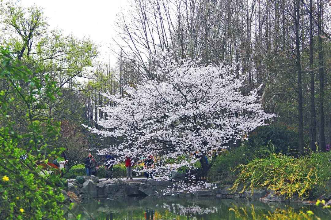 位于水杉大道与盆景园交叉路口,临河孤植的一株东京樱花,树龄已超过四十年,每到花开时分,满树繁花,婆娑树影,倒映河面,令不少游客流连忘返。而一旁弯月形的小河道东岸,还栽有‘十月’樱、‘雨情枝垂’樱、‘小彼岸’樱、‘阳光’樱、‘神代曙’樱等樱花品种,与对岸孤芳独影的老樱花树、水杉林遥相呼应,盛樱时与如镜似月的河面虚实相生,如梦似幻,更有或青或红的小鱼儿,游弋水面,追逐飘落水面花瓣,趣味横生。