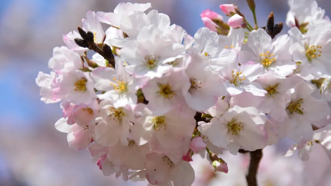 与往日不同,今年它还多了一个极具高颜值的“邻居”——‘美国’樱。当TA全面进入盛花期时,华盖如云,尽显美态。