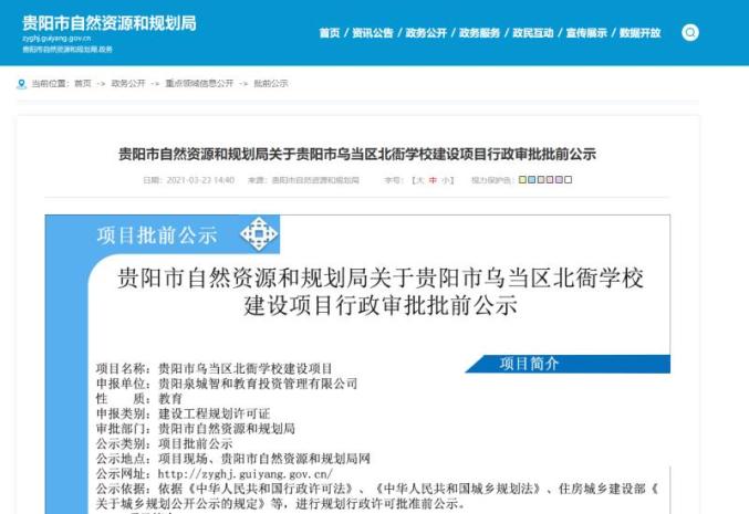 据了解,项目名称为贵阳市乌当区北衙学校建设项目,申报单位是贵阳泉城智和教育投资管理有限公司。该项目位于贵阳乌当区,在法定控规中用地性质为教育用地。项目已办理选址意见书,规划计容用地面积为27156平方米。