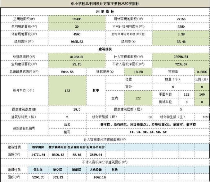 本次审查内容为贵阳市乌当区北衙学校建设项目总图方案,方案主要经济指标:总建筑面积31252.21平方米,其中计容面积23996.54平方米,容积率0.88,不计容面积7255.67平方米,停车位122个(室内平面车位122),建筑占地面积5044.56平方米,建筑密度18.6%,绿地面积9625.83平方米,绿化率35.46%,最高建筑高度19.5米,规划学生数1350人。指标满足《贵阳市城市规划技术管理办法》等相关要求。总图方案并经相关部门会签同意。