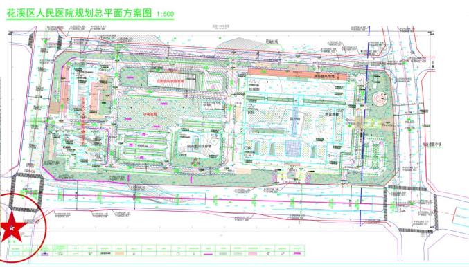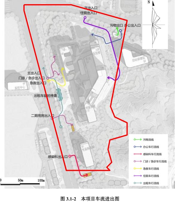 项目分为两期入驻,其中综合医院一期和综合医院二期位于项目北侧,属于综合性诊疗科室,感染楼位于项目南侧为单独建筑。项目车行、人行通道均将综合诊疗科室和感染楼进行区分。