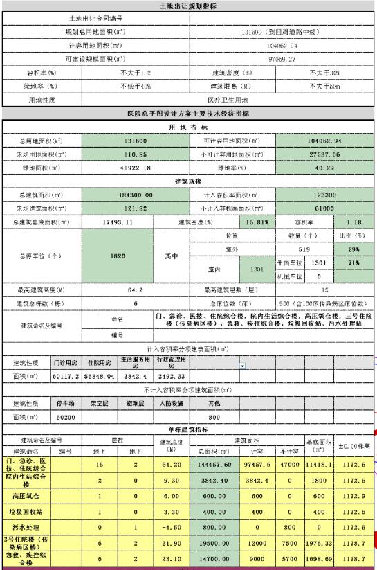 建筑总栋数为6栋,总床位数为900(其中含100张传染病区床位数),最高建筑层数为15层,最高建筑高度为64.2米。详情如下。