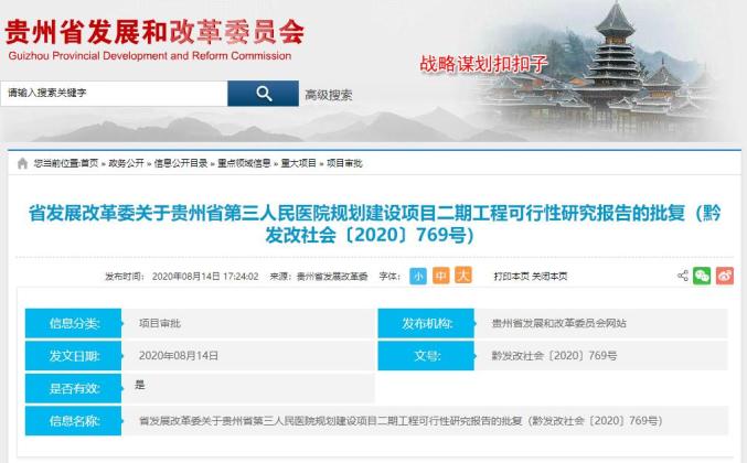 2020年8月,省发展改革委发布关于贵州省第三人民医院规划建设项目二期工程可行性研究报告的批复。经研究,原则同意省第三人民医院规划建设项目二期工程建设项目。