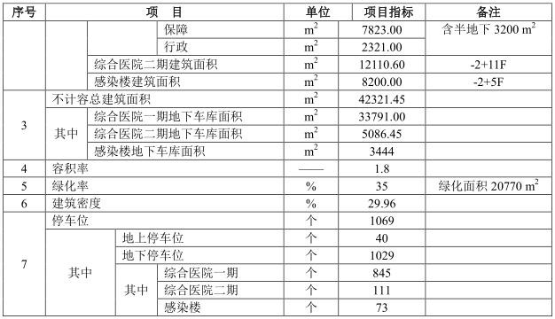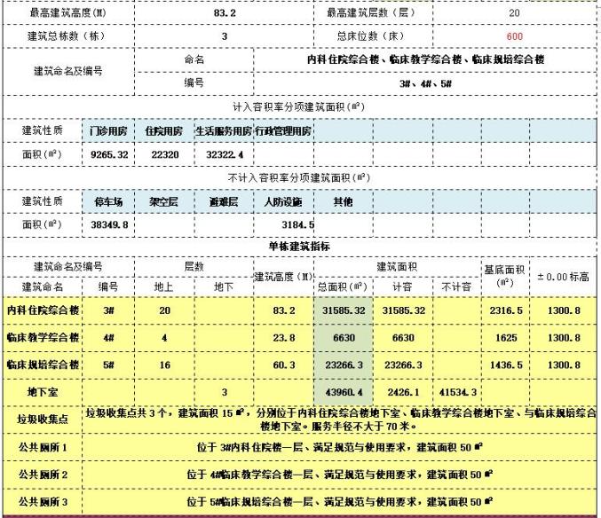 总建筑基底面积5378平方米,建筑密度20.60 %,容积率2.44 ,总停车位1100个。最高建筑高度83.2米,最高建筑层数20层。建筑总栋数3栋,总床位数600床。