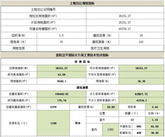 总用地面积26151.27平方米,可计容用地面积26151.27平方米,床均用地面积43.59 平方米,绿地面积9240.1平方米,绿地率35.30 %,总建筑面积105442.02平方米 ,计入容积率面积63907.72平方米。