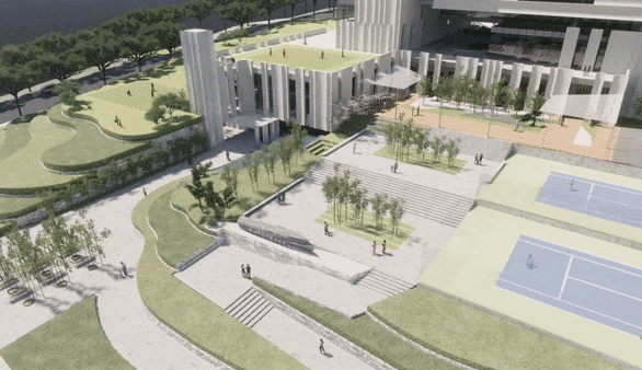 设计选择利用50米的建筑限高,适当拔高建筑至36米,释放室外绿地和公共活动空间。将底部四层作为各类体育、观演活动类用房,上半部分塔楼空间作为相对安静的文化教育及办公管理用房,高效合理地进行动静分区。同时将底层各类活动空间相对离散分布,减少多类活动之间相互影响的同时,合理高效的组织空间、提供多种空间实用的可能性。