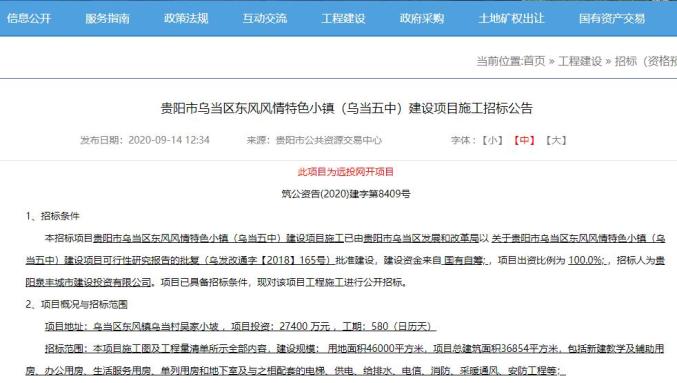 2020年9月,贵阳市公共资源交易中心发布了贵阳市乌当区东风风情特色小镇(乌当五中)建设项目施工招标公告。乌当区将新增一所学校。