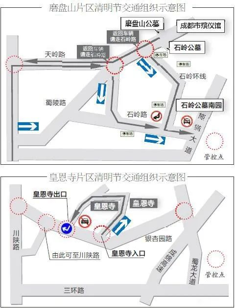 届时,成都交警五分局将对磨盘山公墓、石岭公墓以及成华区附近皇恩寺片区实施临时交通管控。其中,蜀陵路、石岭环线、天岭路至石岭路采取单向通行,而环绕皇恩寺的环线道路将实行“正门进后门出”的单循环。