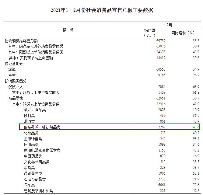基本面上,国家统计局披露2021年1-2月社会消费品零售数据显示,在去年低基数下,前2月社零同比增长33.8%,其中服装鞋帽、针纺织品类同比大增47.6%。