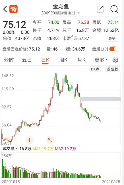 金龙鱼于去年10月15日登陆A股。K线数据显示,金龙鱼上市首日仅触及39.51元阶段低点后,便一路震荡上涨,并于今年1月11日创下145.62元高点,总市值一度突破7800亿元。之后金龙鱼步入下行趋势,仅经过2个多月时间,其股价已经跌破76元关口。