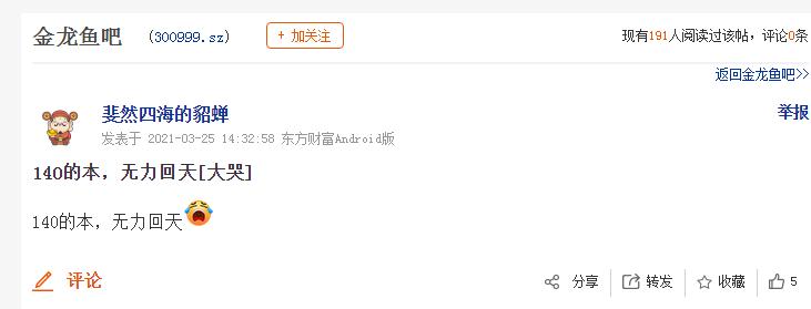 当然不仅是机构投资者,金龙鱼的19.51万户股东可能也是比较崩溃的。3月25日在股吧中有投资者就表示,亏了10000块割肉走人了。