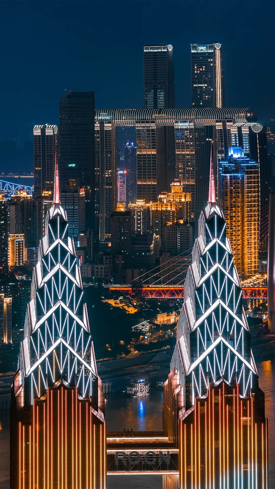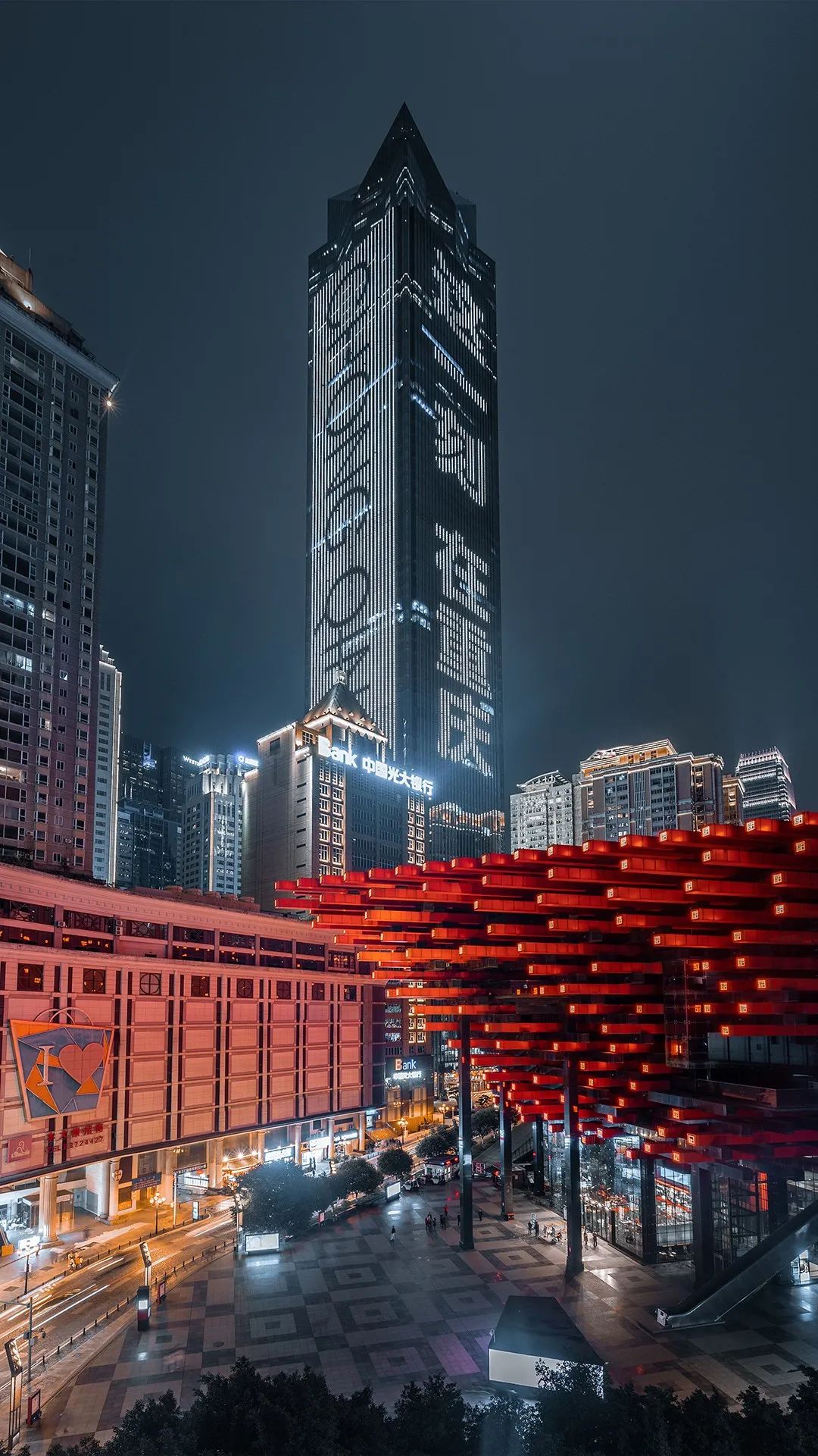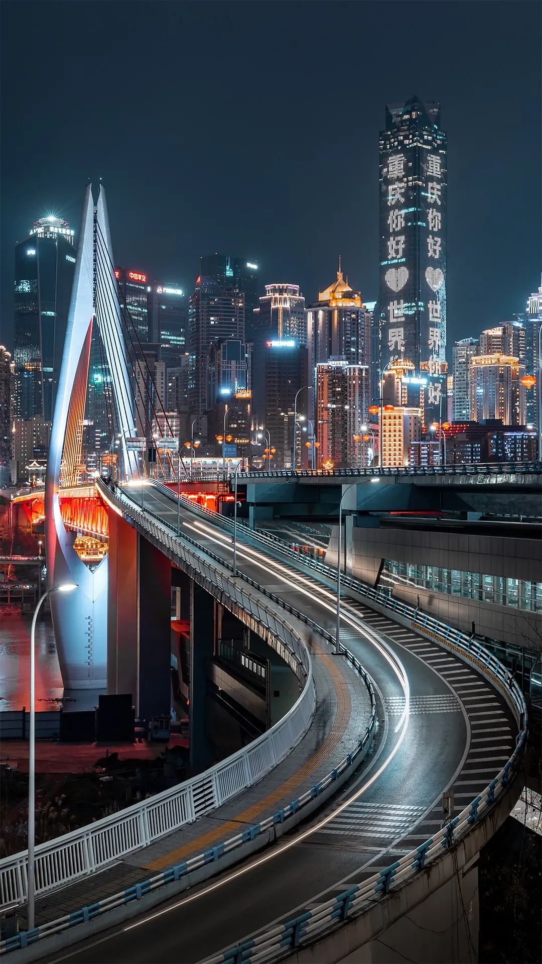 “重庆你好❤世界你好”,夜晚的山城流光溢彩、独具魅力。