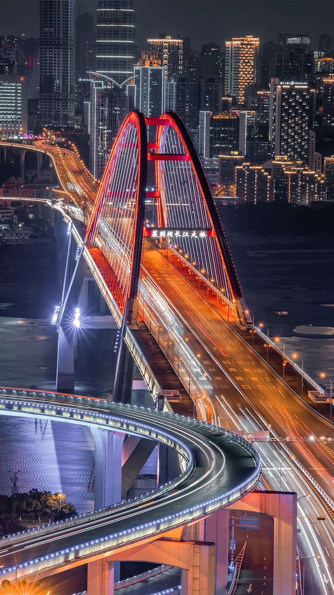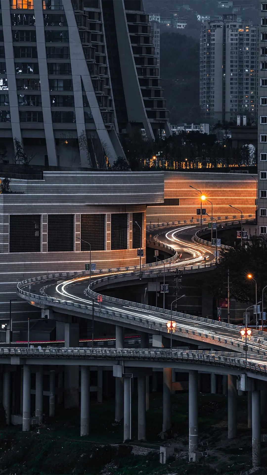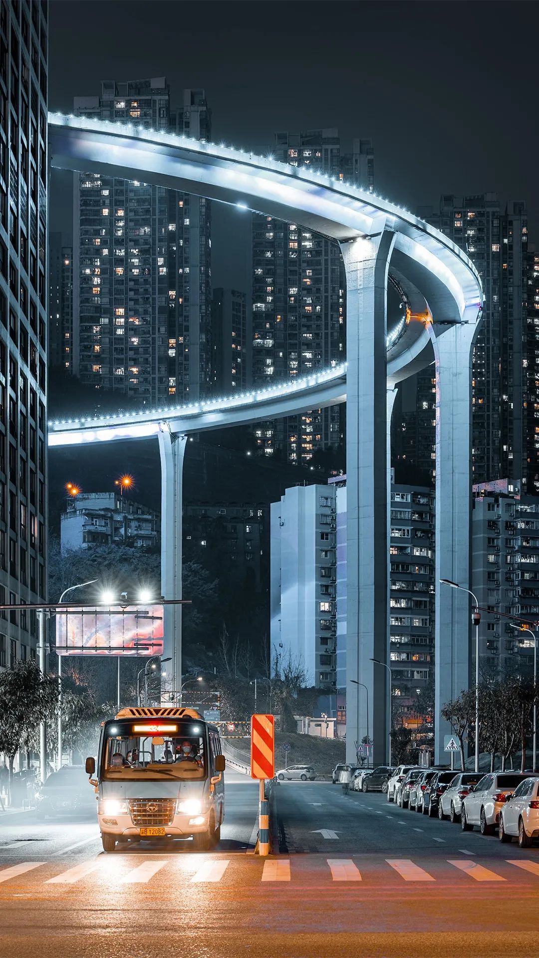 苏家坝立交的高低落差,把重庆的立体多维体现得淋漓尽致,桥下驶来的公交车,在夜幕中显得十分有趣。